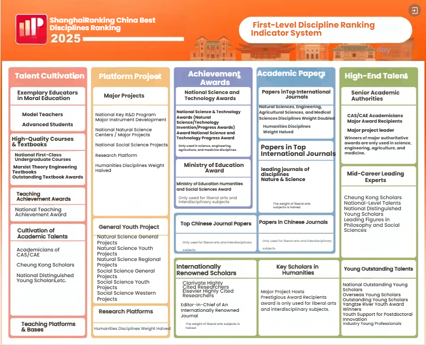 The ranking system comprises five indicator categories—Talent Cultivation, Platform Projects, Achievements Awards, Academic Papers, and High-End Talent—with 19 sub-indicators and over 200 observational metrics reflecting disciplinary competitiveness. All ranking data derives from authoritative sources including the Ministry of Education, Ministry of Science and Technology, National Natural Science Foundation of China, and international and domestic academic databases.