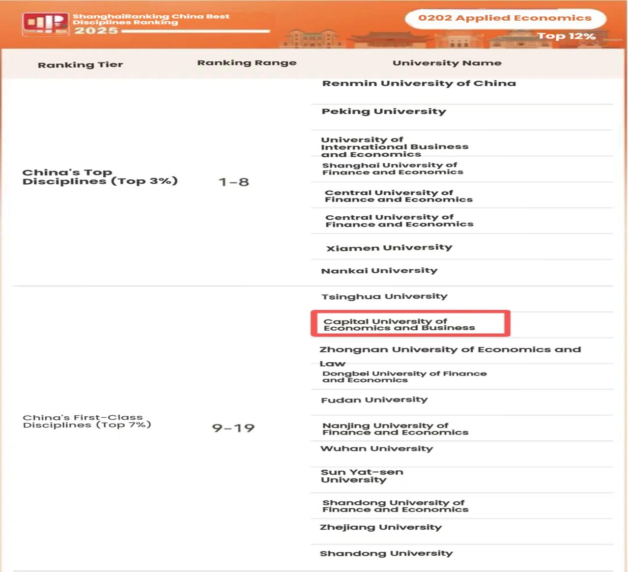 CUEB Shines in 2025 ShanghaiRanking: Applied Economics Tops 10 and 7 Disciplines Listed